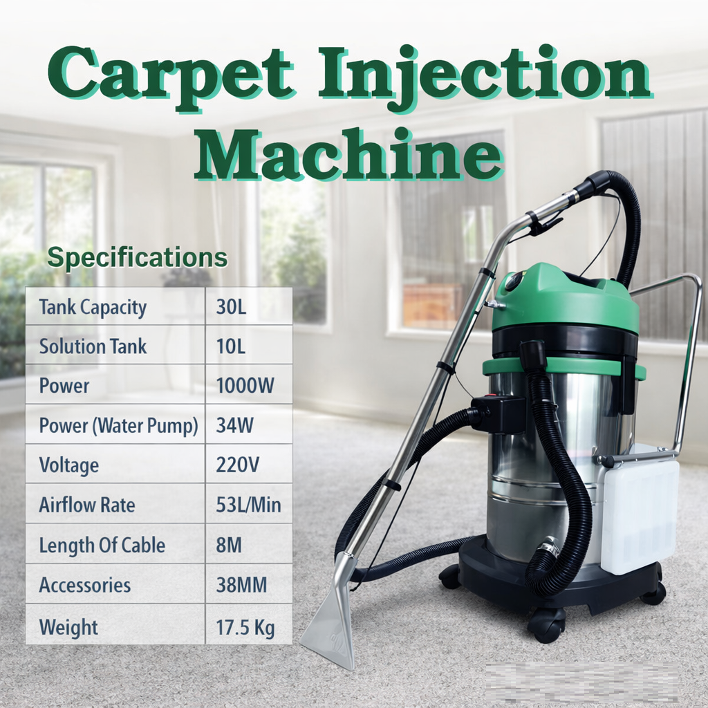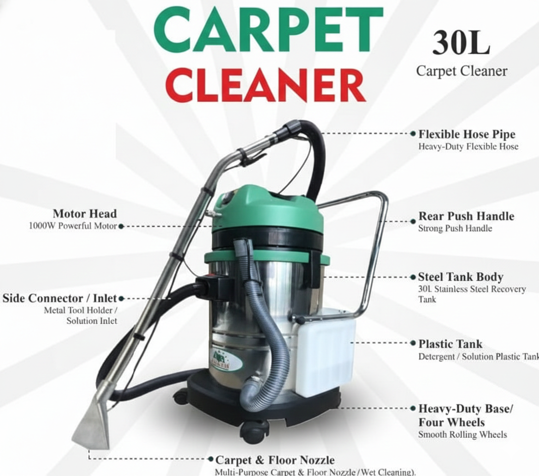 High-performance 1000W suction motor combined with a 34W water pump delivers deep injection and extraction cleaning, removing embedded dirt, stains, and moisture from carpets efficiently.Equipped with a 30L recovery tank and 10L solution tank, allowing longer cleaning sessions without frequent refilling — ideal for mosques, offices, hotels, halls, and large carpeted areas.