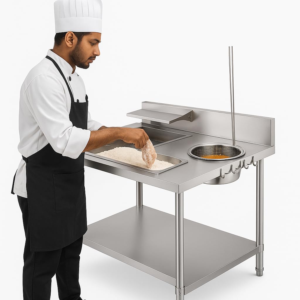 Samnantools Stainless Steel Breading Table for Broast| with Shaking Baskets, Powdering Unit, Dipping Unit, Splash Guard & Under Shelf